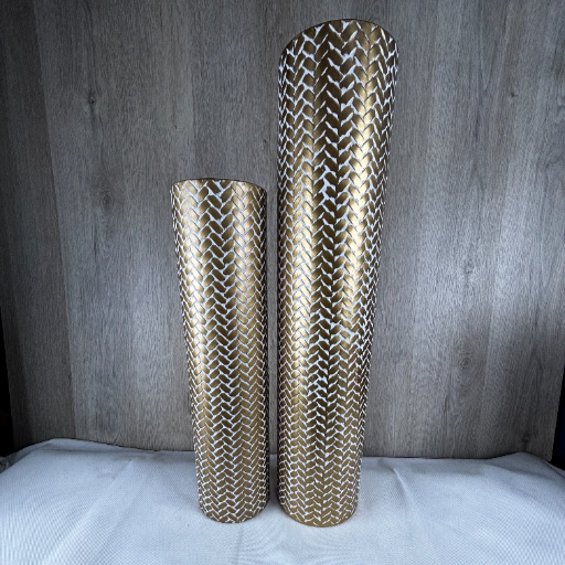 Mit den Sziqiqi Bodenvasen setzen Sie eindrucksvolle Akzente in jedem Raum. Die aus hochwertigem Metall gefertigten Vasen überzeugen durch ihre elegante, zylindrische Form und das aufwendig gearbeitete, geprägte Fischgrätmuster in glänzendem Gold.