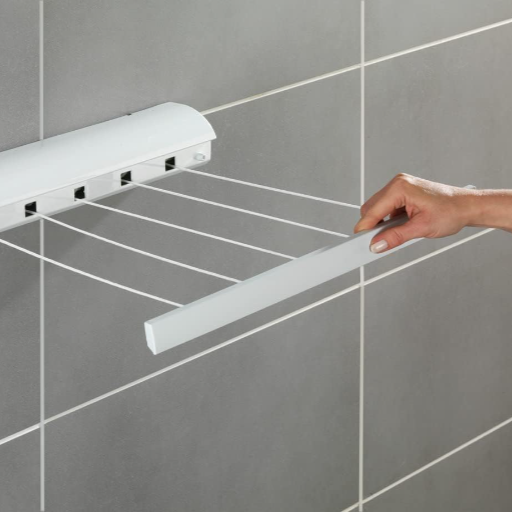 Die fünf reißfesten Leinen lassen sich stufenlos ausziehen und spannen, wenn sie gebraucht werden, und verschwinden bei Nichtgebrauch platzsparend in der Wandbox. Ideal für Wohnungen, Balkone oder Badezimmer mit begrenztem Platzangebot.
